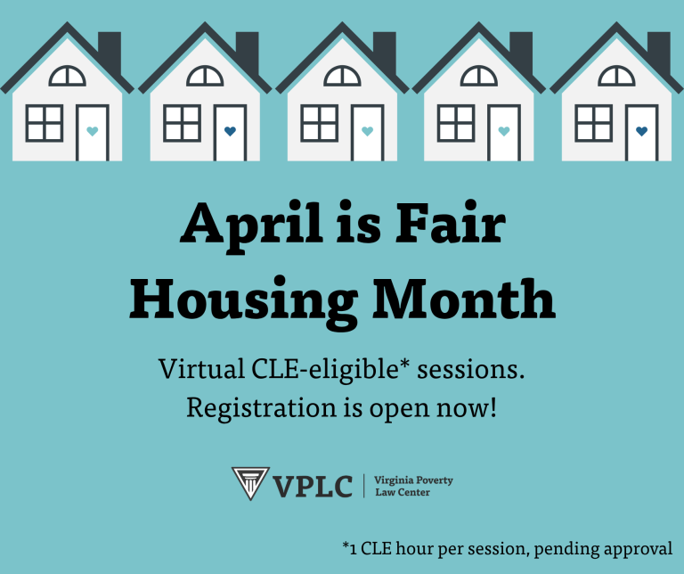 April is Fair Housing Month Join VPLC housing advocates, allies, and partners for a series of virtual lunchtime trainings about pressing topics in housing law that impact low-income Virginians. Pending approval, each session will be 1 CLE credit.
